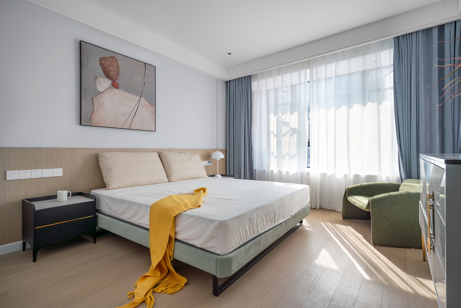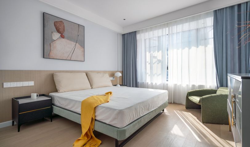 步入主臥,設(shè)計師繼續(xù)運用舒適、溫柔的筆觸,書寫了一封關(guān)于靜謐氣韻的詩篇。