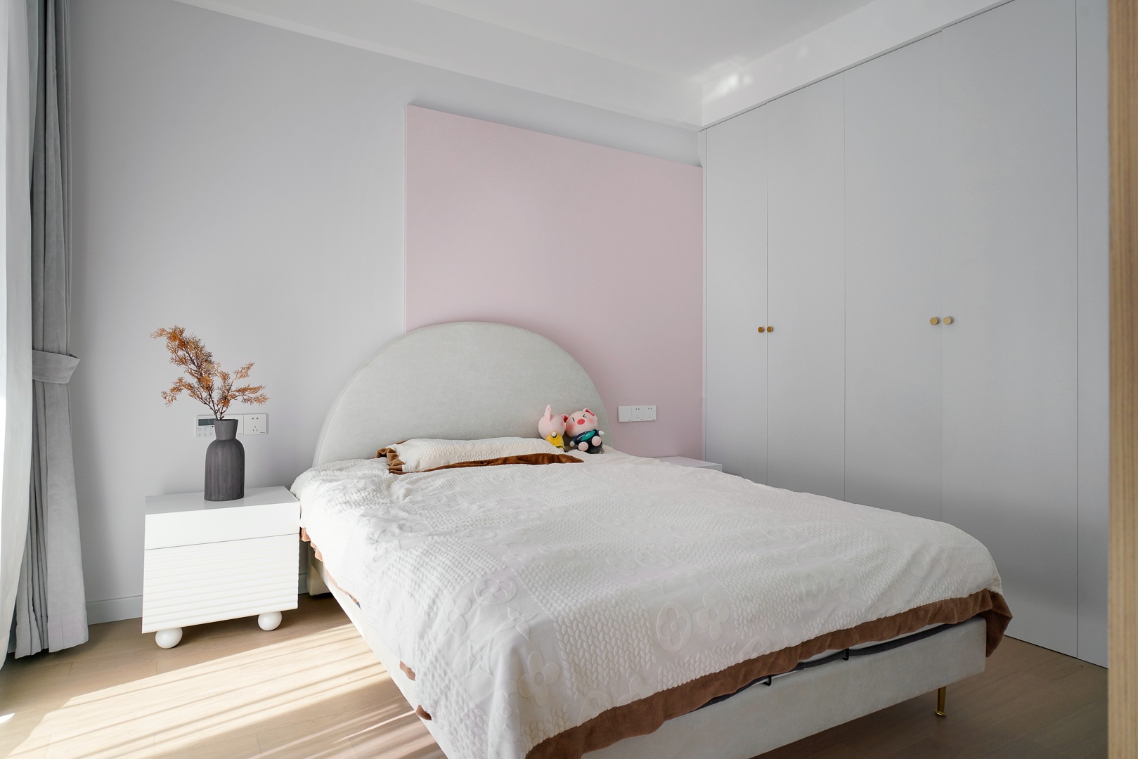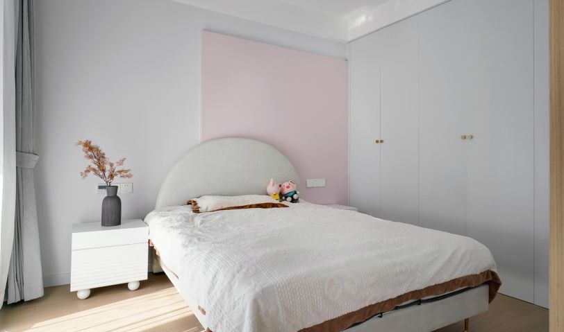 銀灰色與淺粉色調(diào)和出了一間夢幻浪漫的女兒房,簡約的線條有序勾勒出溫柔的宜居感。