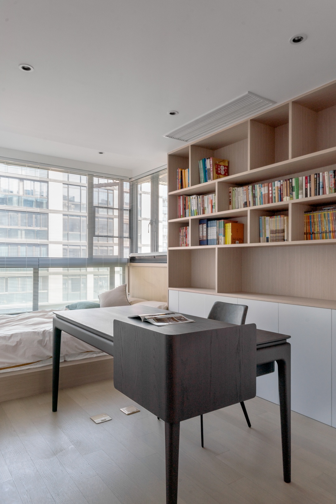 次臥設(shè)計成了榻榻米房的形式,由于這個房間空間相對寬敞,設(shè)計師將整個書房裝進(jìn)了臥室里,實現(xiàn)了一室多用的功能。