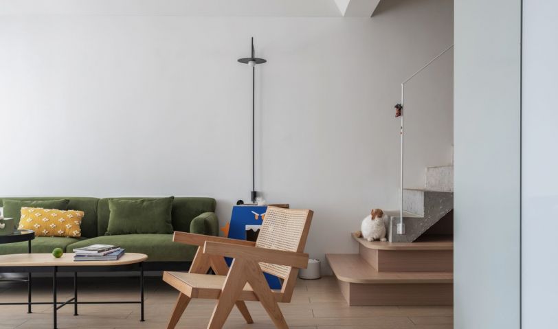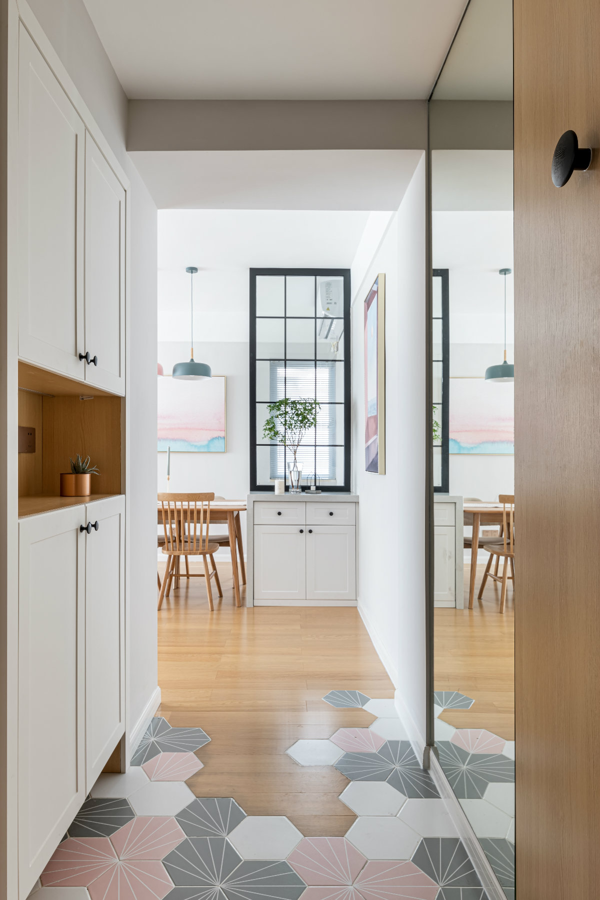玄關(guān)進(jìn)門右手邊墻面比較長,為了避免形成比較長的走廊,在右手邊的墻面上采用大面積鏡子與左邊鞋柜同寬,既可以擴大視覺效果也可以起到穿衣鏡的效果。另一半則用木飾面拼接,打底后完成面與鏡子做平,點綴紐扣掛飾,方便進(jìn)門隨手掛起來包包等物品。鞋柜從廚房借出位置,鞋柜下部鏤空15公分,裝有燈帶,可以方便換鞋,也可以放置掃地機器人的充電。中部鏤空部位可以放置小物件,同樣留有燈帶。玄關(guān)天花的燈具是感應(yīng)的內(nèi)嵌式筒燈,可以聲控和紅外控制,這樣晚上回來打開門便會亮起來,是不是滿滿的儀式感呢!玄關(guān)長方形考慮到需要與木地板的拼接,采用時下流行的六角磚,與木地板自然拼接。粉色,灰色,白色,正是我們整體的色彩搭配。