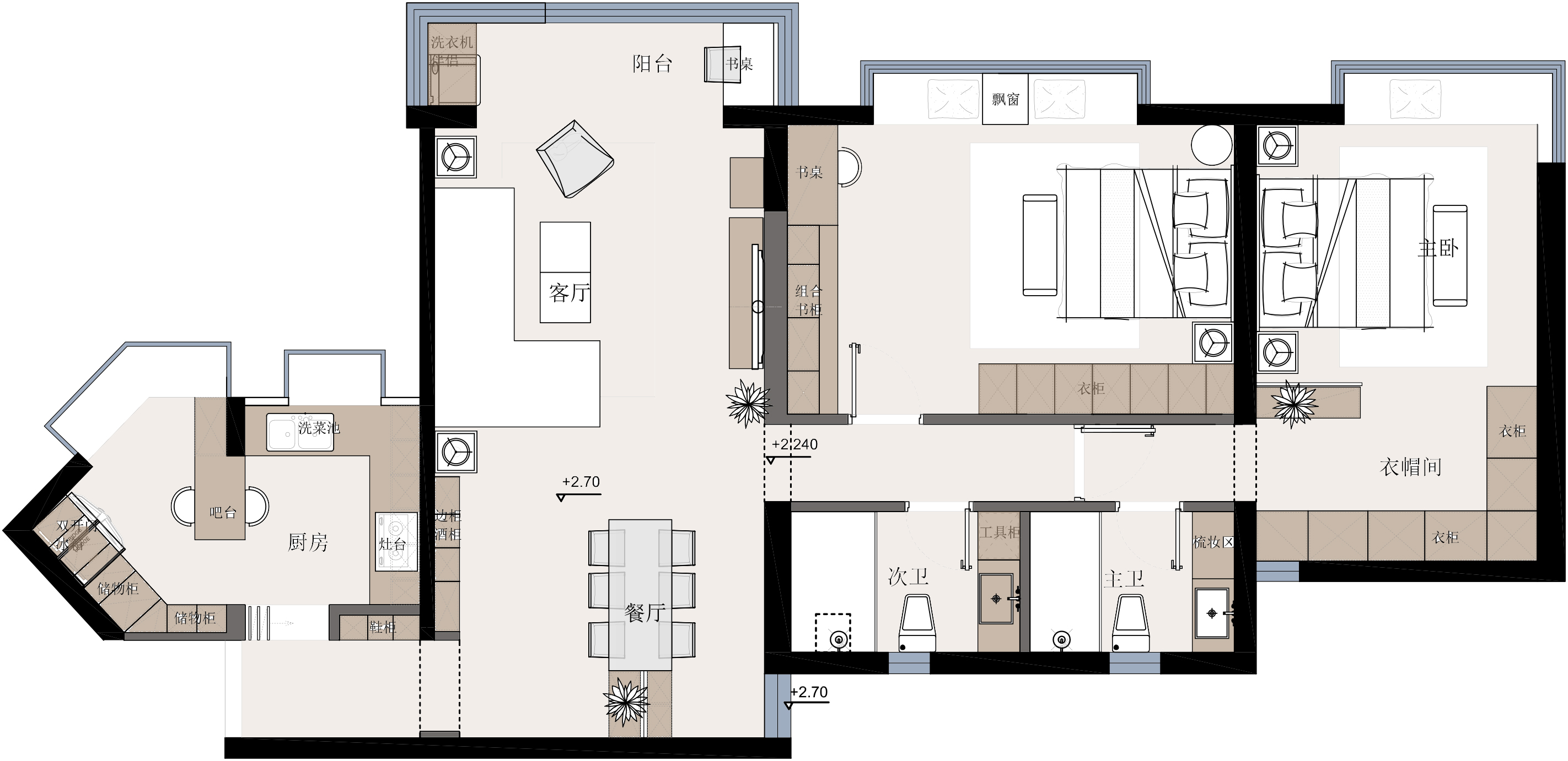 主臥進(jìn)門處設(shè)計步入式衣帽間,左手邊做了邊柜隔斷避免進(jìn)門看到床頭的尷尬與不安全感。應(yīng)業(yè)主要求,兩個臥室地面采用原有紫檀木實木地板翻新后再利用,也是一種回憶了