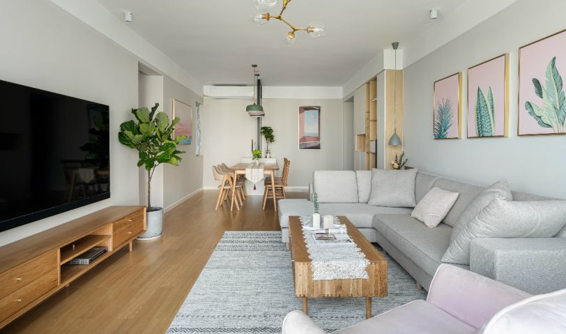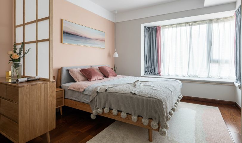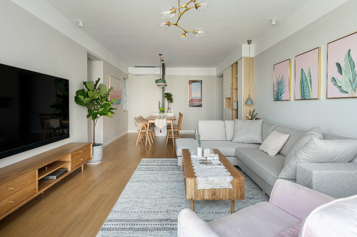 客餐廳以暖色墻面為主要背景基調(diào),灰色布藝沙發(fā)呼應(yīng),原木實木電視柜與茶幾同材質(zhì),與原木色地板一致,粉色掛畫與單人沙發(fā)和抱枕作為點綴,淡淡的慵懶的也很莫蘭迪!飽和度低的基底,綠色的植物,像春風(fēng)柔柔的拂過,又像冬日的暖陽灑下。
