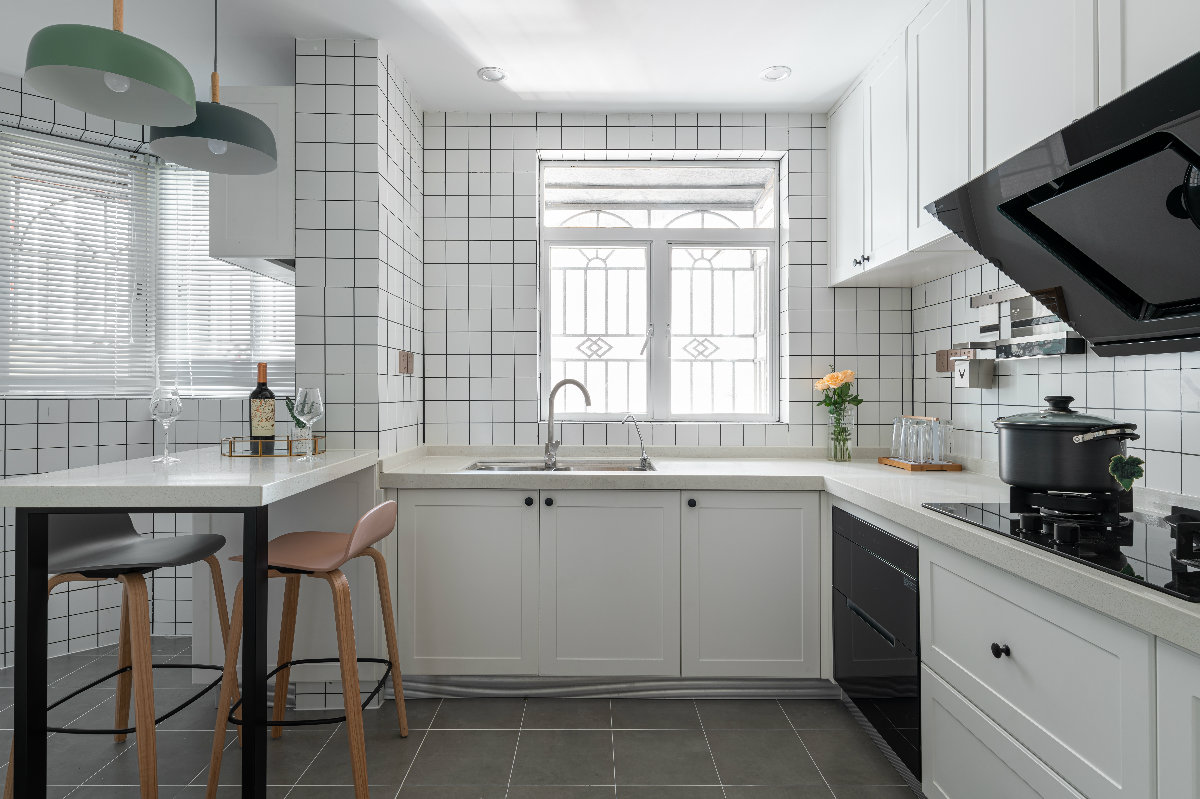 廚房墻面采用小白磚填黑色美縫,地面灰色水泥磚,搭配白色的亞光烤漆柜門點綴黑色小紐扣,文藝感滿滿。 將原本雜物間打掉融入廚房,利用吧臺將廚房分為操作區(qū)與儲物區(qū)。吧臺方便夫婦簡餐,或者吃早餐用。當(dāng)然也增加廚房的互動,做菜的時候另一半在陪伴,說說話聊聊天吐吐槽,做菜的時間也不會那么無趣,飯菜完成,在吧臺兩人對坐喝點紅酒,品嘗愛人的手藝,生活就是這樣,平淡中也要來點浪漫與儀式感! 吧臺靠窗承重墻部分做了儲物區(qū),設(shè)置3層抽屜,方便儲物,臺面設(shè)計幾個插座,可用與手機充電等。