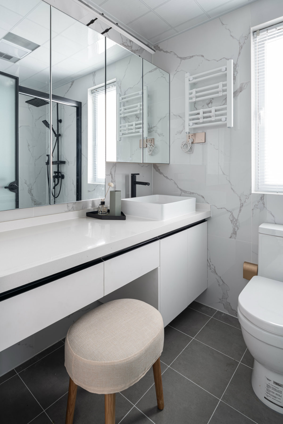 長條的洗手臺底部鏤空,一部分作為梳妝臺使用,一部分為洗手臺。整面鏡柜足夠過的儲物空間,鏡面的反射也擴大整體空間。淋浴在進(jìn)門右手,墻面有設(shè)計翻折座椅,可以方便老人使用。墻面運用的是魚肚白花紋大板磚,擴大空間感,地面灰色水泥磚。