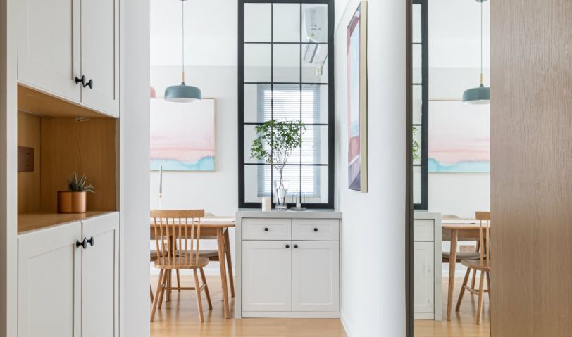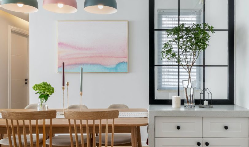 餐邊柜與屏風(fēng)的結(jié)合,既增加了餐邊柜的儲物功能,也隔斷玄關(guān)進(jìn)門即是小窗,增加玄關(guān)景的效果。點綴新鮮的植物或鮮花浪漫又溫馨。1800的大餐桌,親友過來聚餐,兩人餐桌上工作都沒有問題,餐椅選用溫莎椅和泰國椅搭配,也是很有意思,太太喜歡有扶手的椅子,先生喜歡實木椅子都可以隨意選擇搭配。