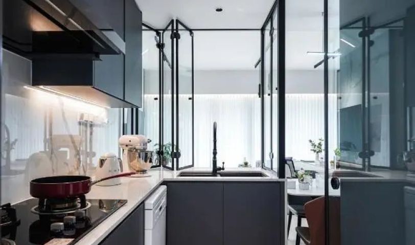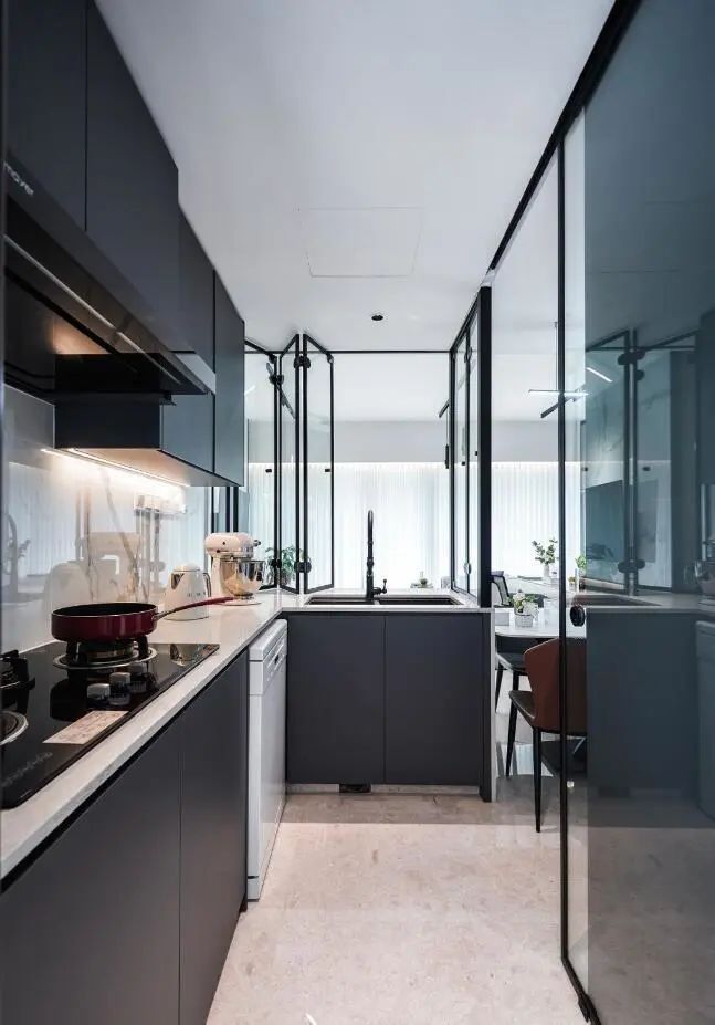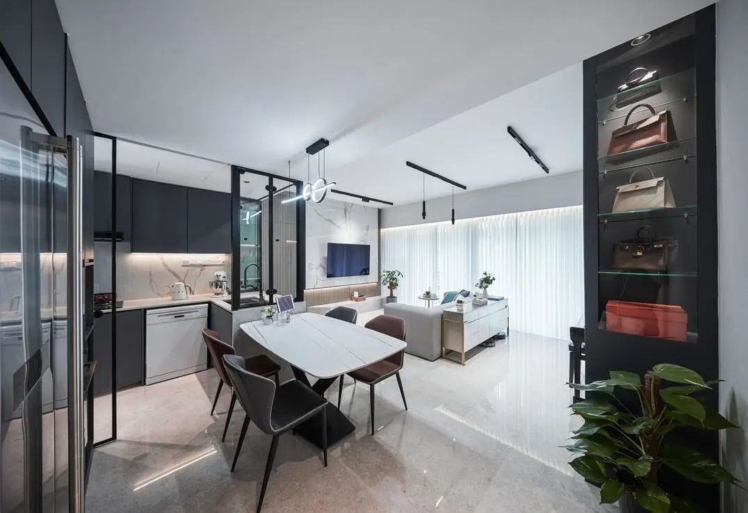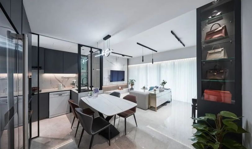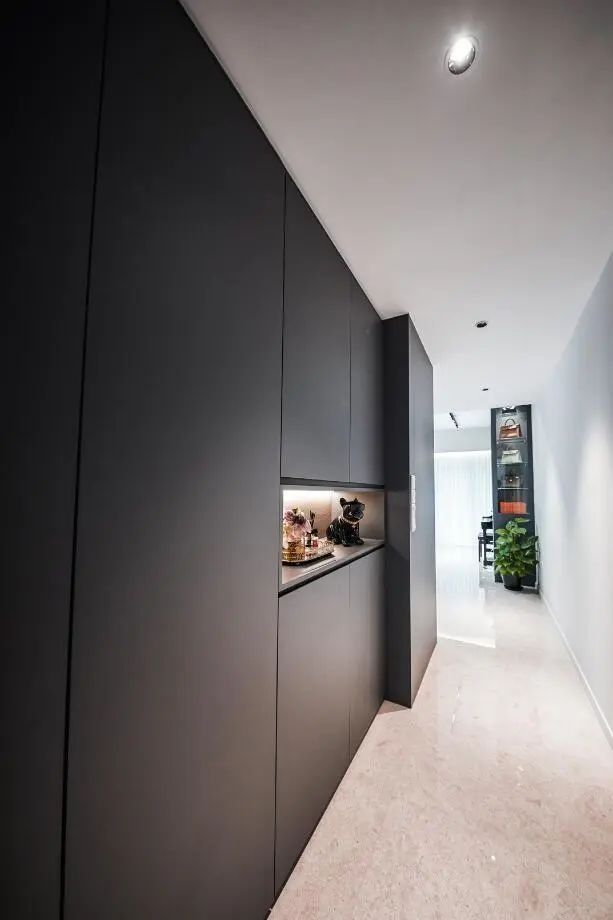 進(jìn)門(mén)一條長(zhǎng)走廊,業(yè)主給利用起來(lái)裝上一排頂天立地式的柜子,收納量猶如一間衣帽間一般,并且黑色的柜體,給人穩(wěn)重的視覺(jué)效果,在進(jìn)門(mén)的那一刻就給人留下了深刻的印象。