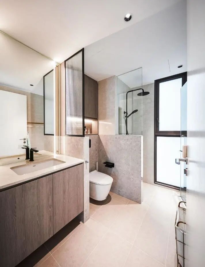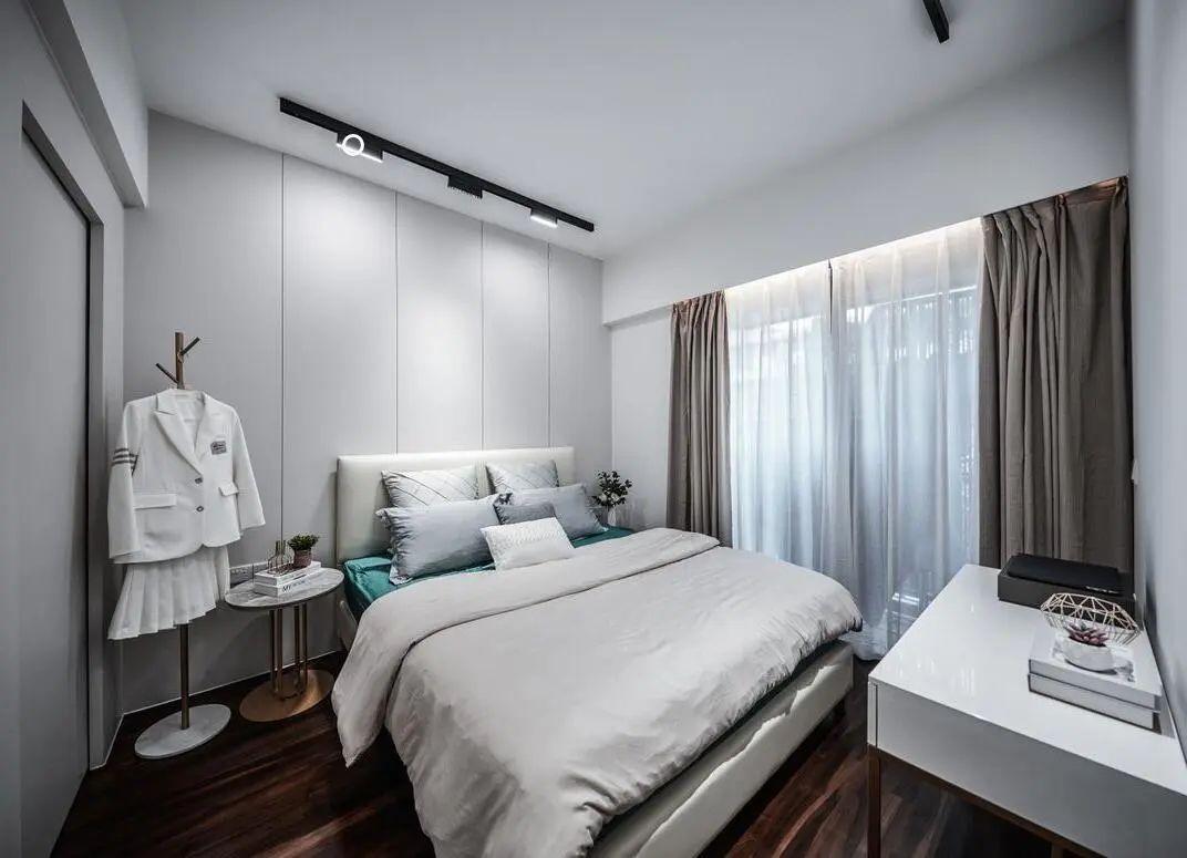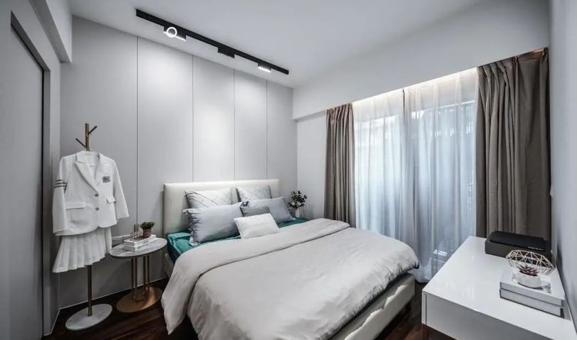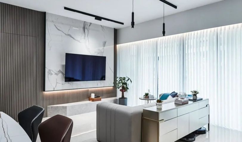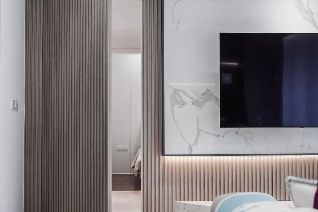 客廳背景墻旁做一體式的隱形門(mén),設(shè)計(jì)上更有美感,視覺(jué)上延長(zhǎng)了電視墻的寬度,起到了很好的裝飾效果。