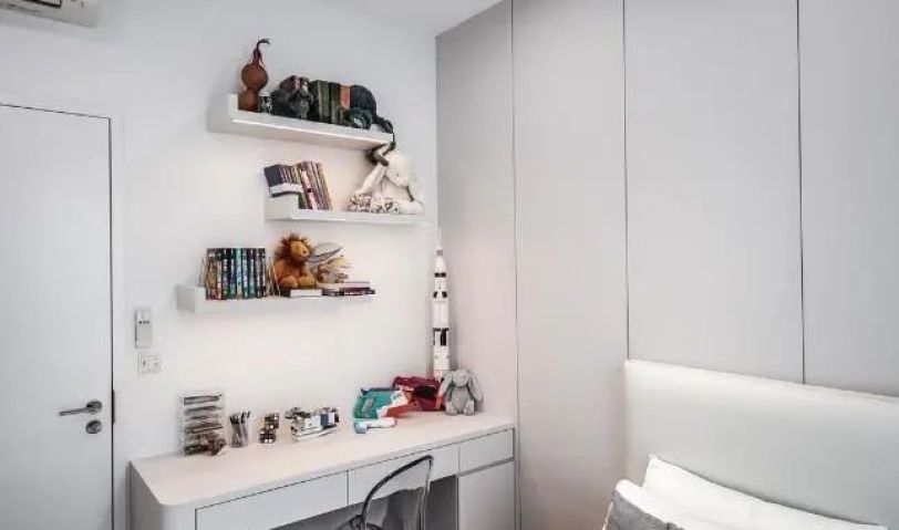 沙發(fā)不靠墻,后方的空間騰出來(lái)打上柜子留出鋼琴的擺放位置,將這里打造成多功能房使用,給居者預(yù)留出一個(gè)陶冶情操的空間。