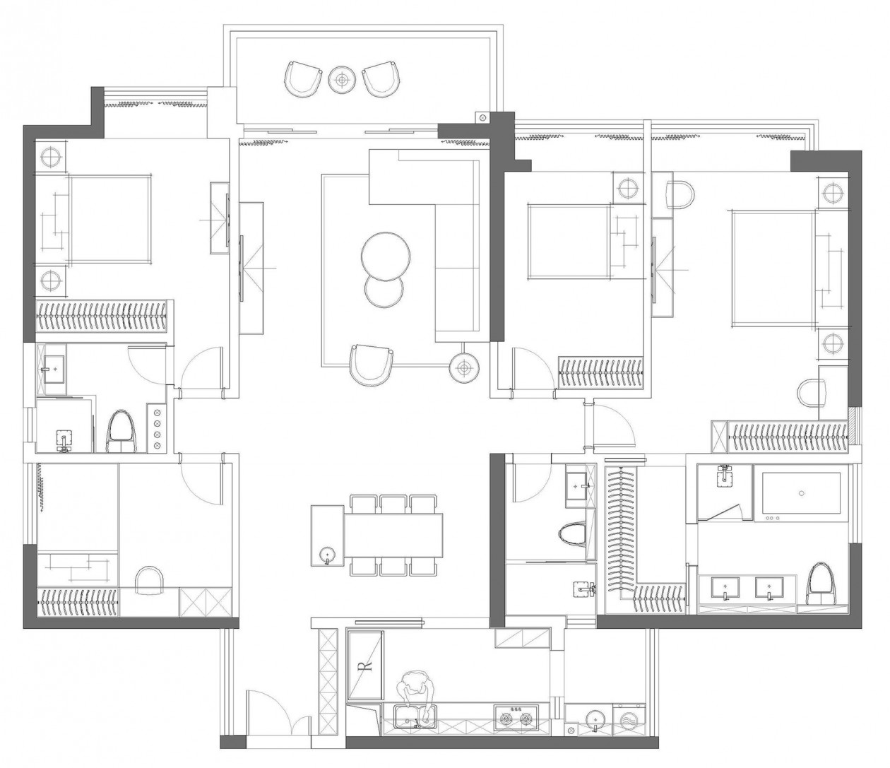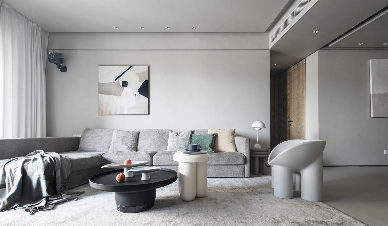 業(yè)主認為家是純粹之地,最重要功能性就是能夠擁有放松身心的休息空間。在家具選擇上摒棄不必要的形式主義,L型豆腐塊沙發(fā)+舒適座椅,軟裝設(shè)計回歸實用性。同樣利用圓弧來弱化棱角,美化裝飾,張弛有度,不顯山不露水便一舉兩得。