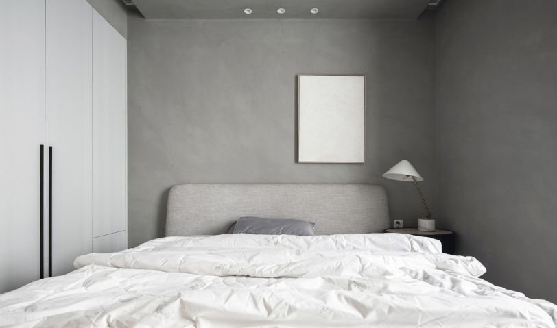 次臥與整體空間色調(diào)保持一致,同樣以簡潔為主,柔軟的白色床品搭上整體的水泥色色調(diào),給人一種干凈舒服的感受,整面衣柜也滿足了日常衣物的收納。