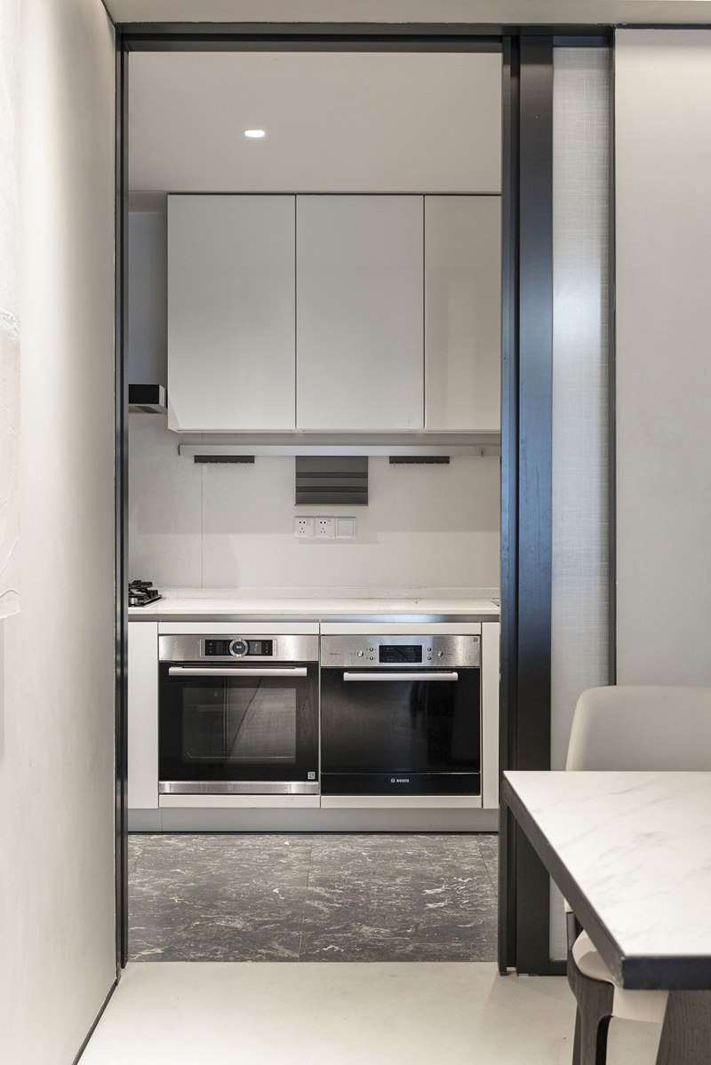 統(tǒng)一色彩材質(zhì)使得功能區(qū)被自然劃出,餐廳以素色為背景,明亮色系在視覺上放大整體空間,一小束綠植點亮生活的盎然,自然又不刻意的原始質(zhì)感貫穿始終。