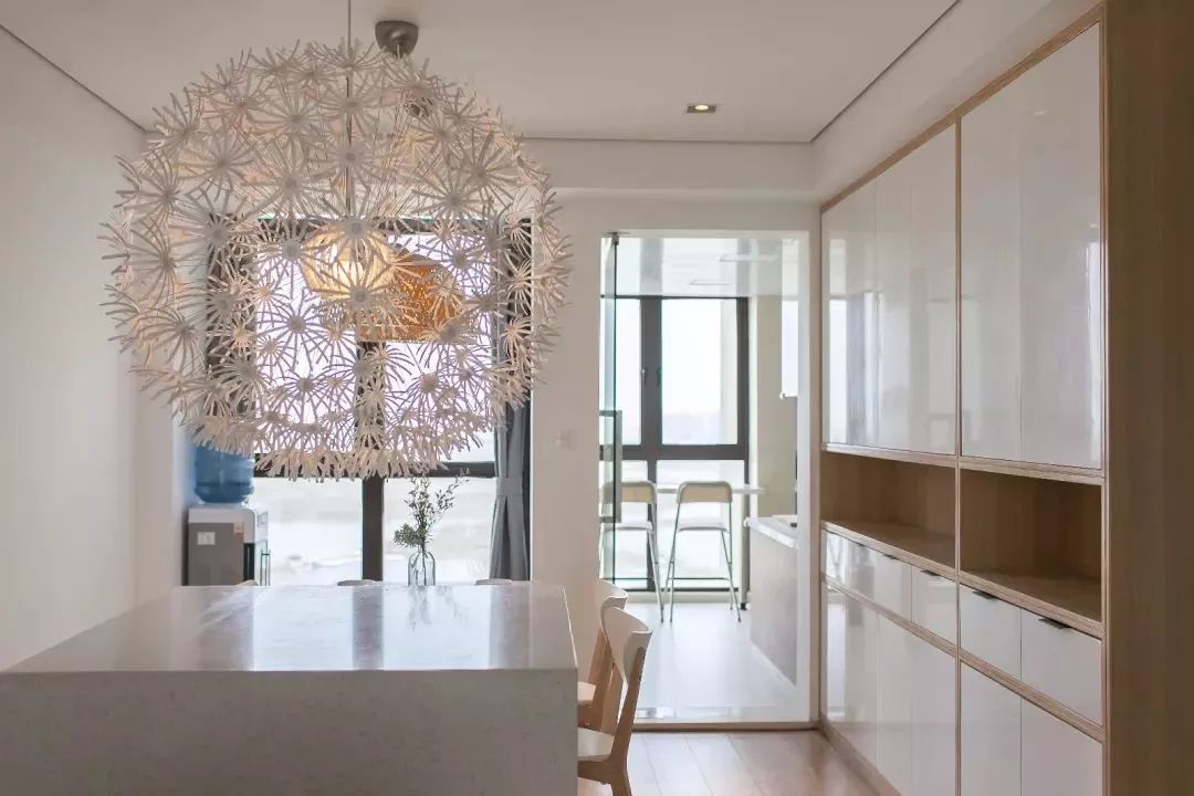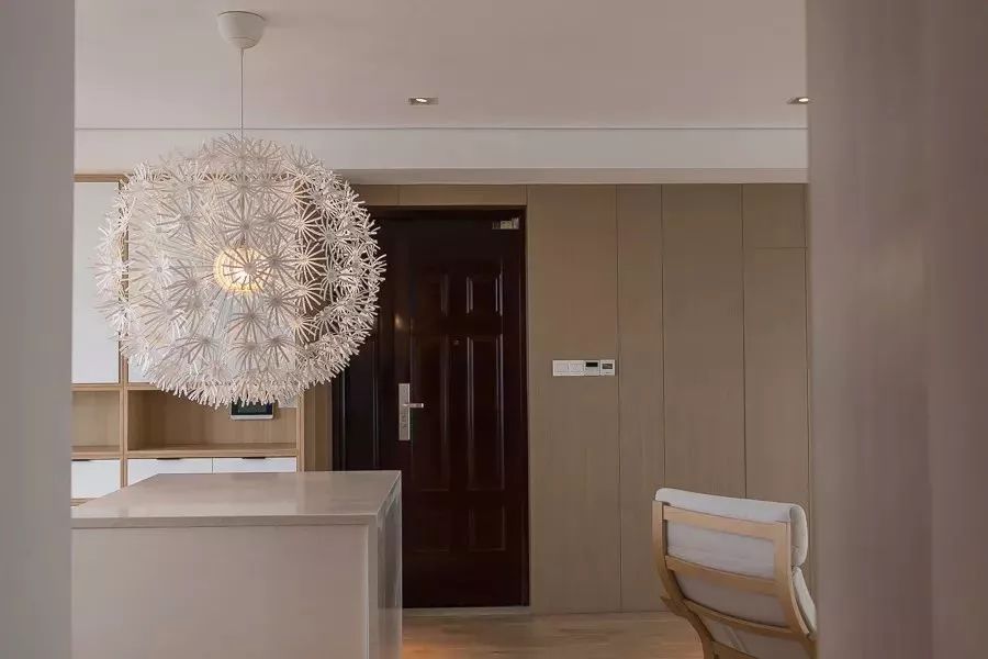 入戶右手邊,布置原木+白色拼接鞋柜,透過餐廳的球形燈,一進(jìn)門就能感受到溫情優(yōu)雅的居家氛圍。