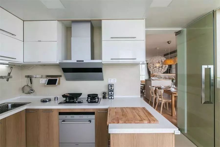 雖然廚房比較寬敞,但也是根據(jù)戶型面積,設(shè)計成U型的廚房操作臺,靠近門口這個位置,也可以站人,整個廚房可以容納多位家人同時操作,非常實用。
