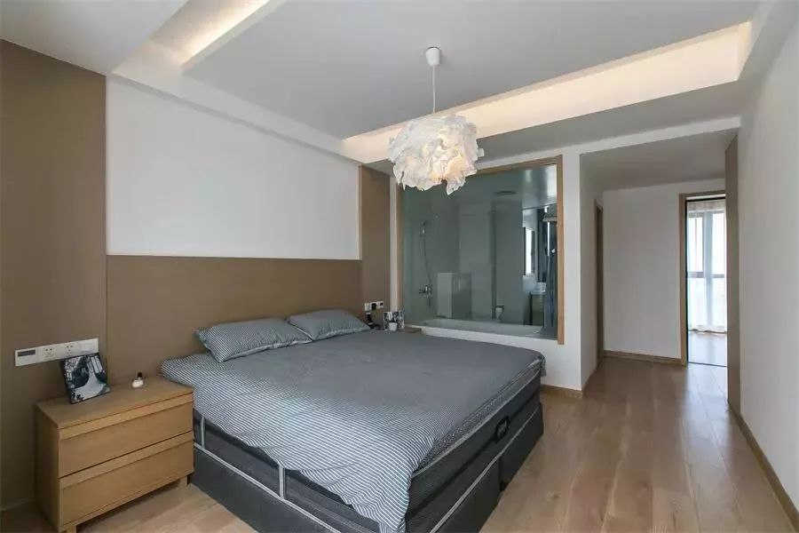 木質(zhì)床頭背板,搭配灰色的軟質(zhì)高床,簡單而舒適。主臥吊頂留空,嵌入燈帶,光線柔和溫馨,很適合放松休息,可以快速進(jìn)入睡眠狀態(tài)。