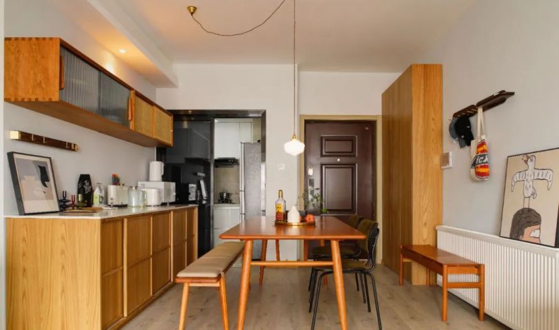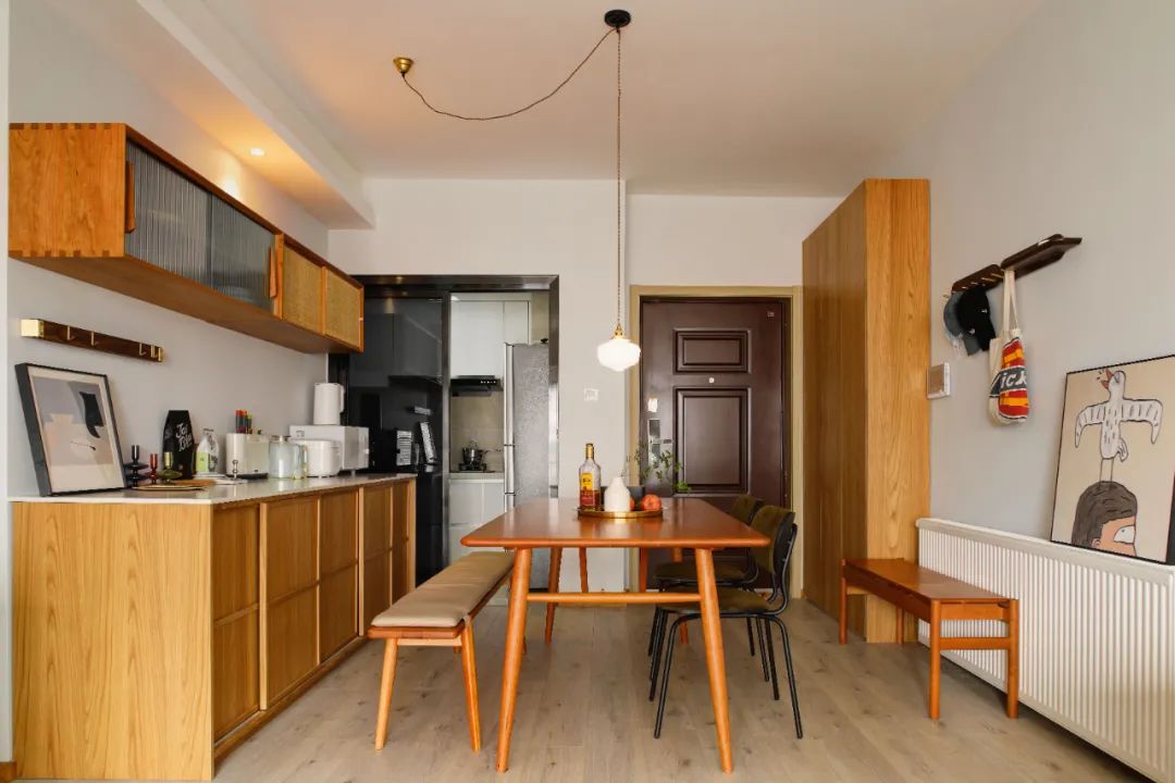 考慮到整個戶型為橫廳,為保證設計的整體性,餐廳選擇了同色系的木質餐桌與邊柜,讓視覺上保持一致。