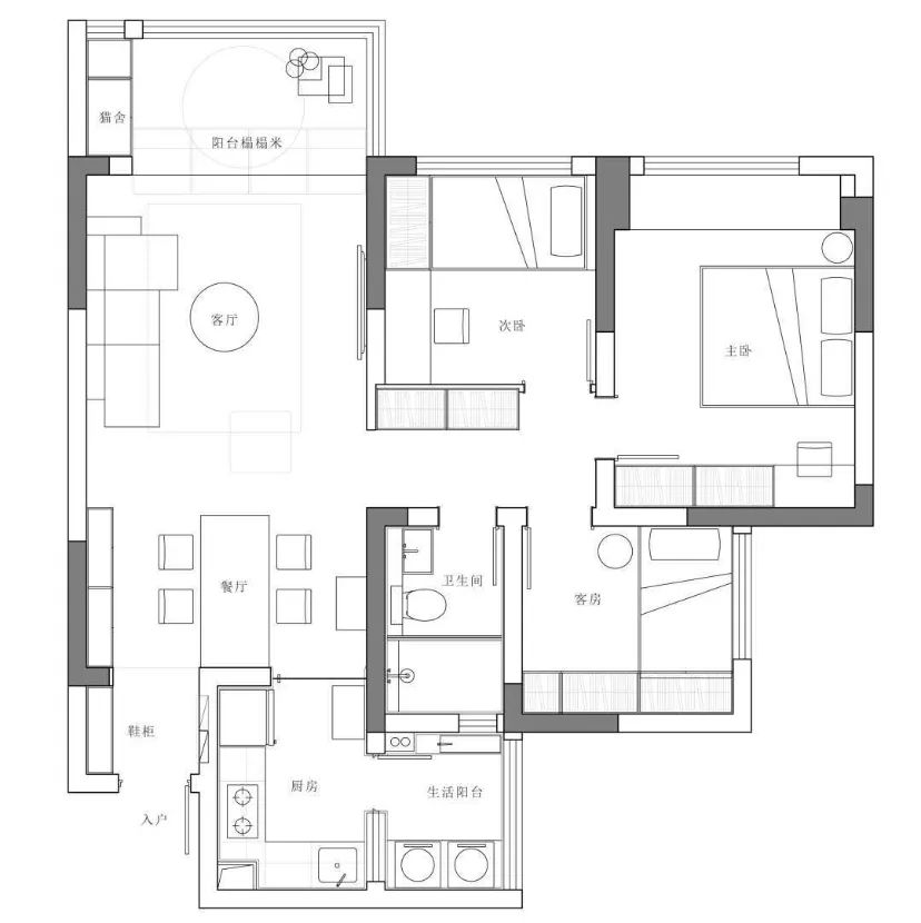 這套三室一衛(wèi)的房子作為過渡房,后期會(huì)有換房的可能性。屋主妹妹及好友在重慶生活,川渝兩地交通十分方便,再加上屋主熱情好客的性格,希望留出一間臥室給他們。