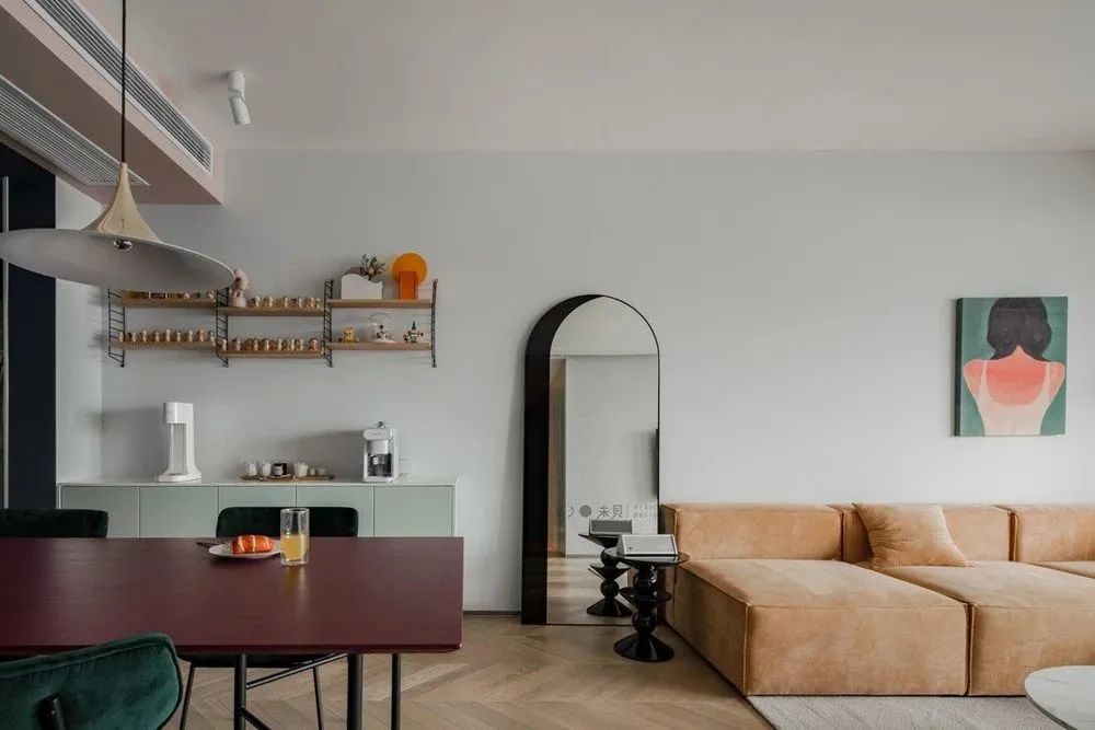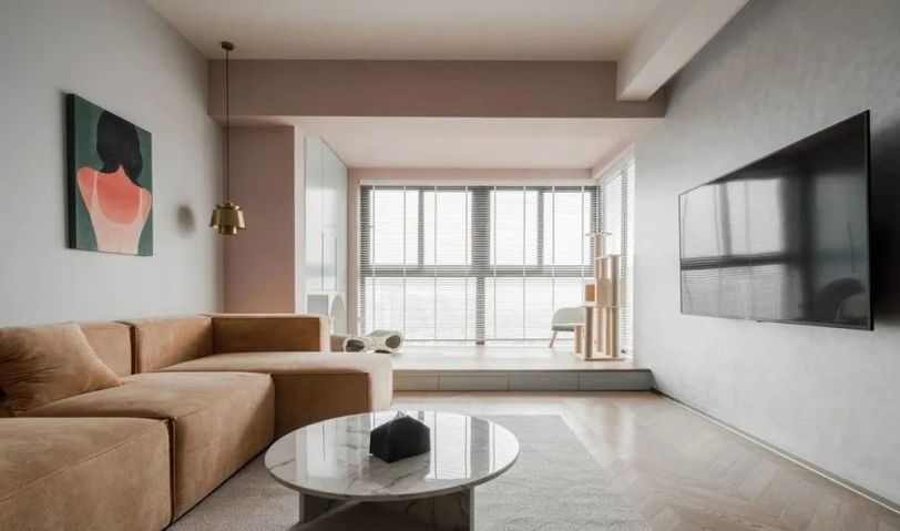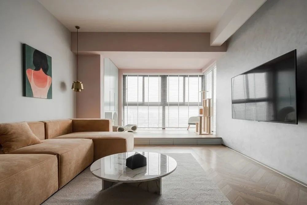 整個(gè)客餐廳墻面刷低飽和度淺灰色墻漆,電視背景墻刷天鵝絨藝術(shù)漆,地面鋪屋主喜歡的人字拼木地板,增加空間材質(zhì)的層次感。