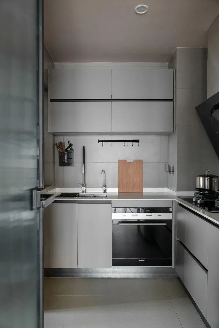 廚房采用鐵藝磨砂玻璃門,增加采光,從客餐廳公區(qū)看進(jìn)去也不會(huì)顯得雜亂。