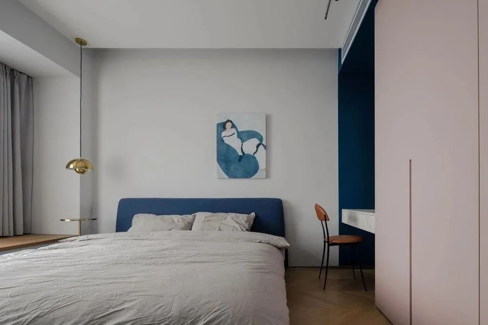 主臥靠床頭的方向是梳妝臺(tái),梳妝時(shí)椅子作為功能性的坐具,平時(shí)可以放在床頭臨時(shí)放置物品。