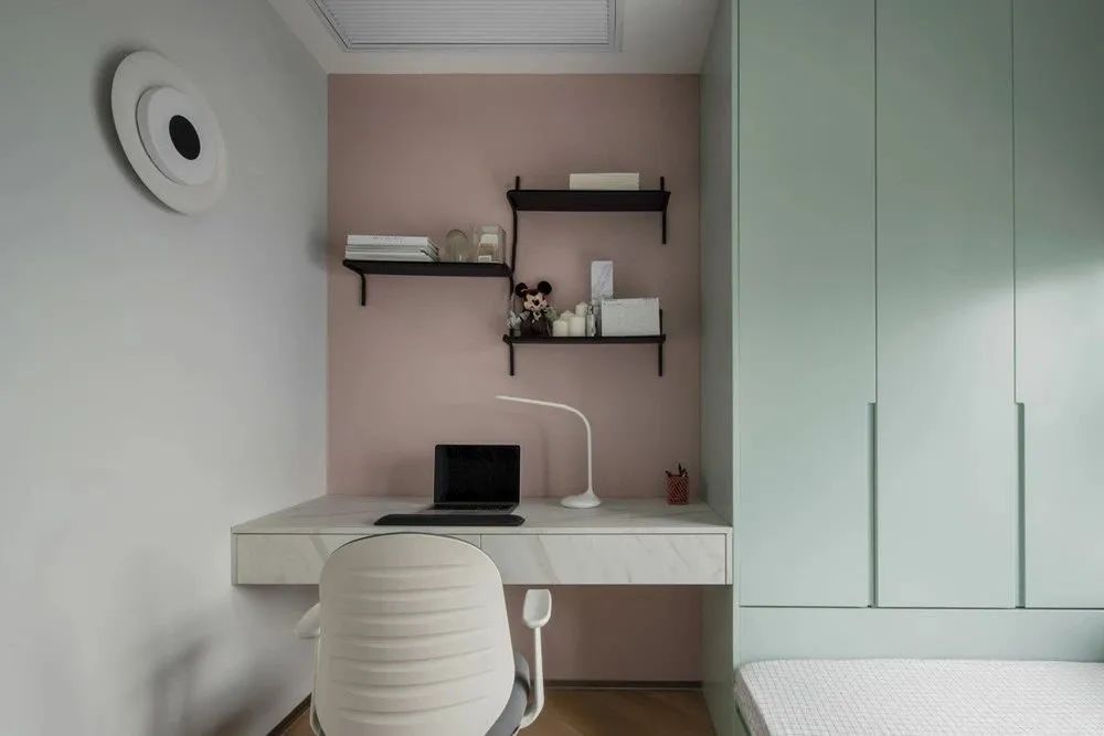 陽臺(tái)榻榻米部分墻面和頂面統(tǒng)一刷了淺粉色,柜體采用豆青色的烤漆門板,青春洋溢又不張揚(yáng)。