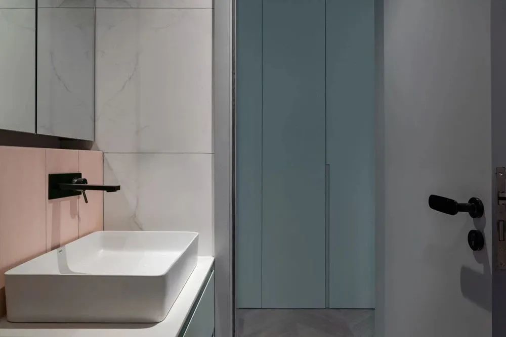 衛(wèi)生間采用壁掛式馬桶,方便日常清潔。洗面盆上方利用暗埋龍頭和馬桶水箱的厚度做了一整面鏡柜,收納洗漱用品,功能強(qiáng)大。