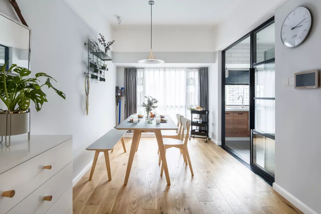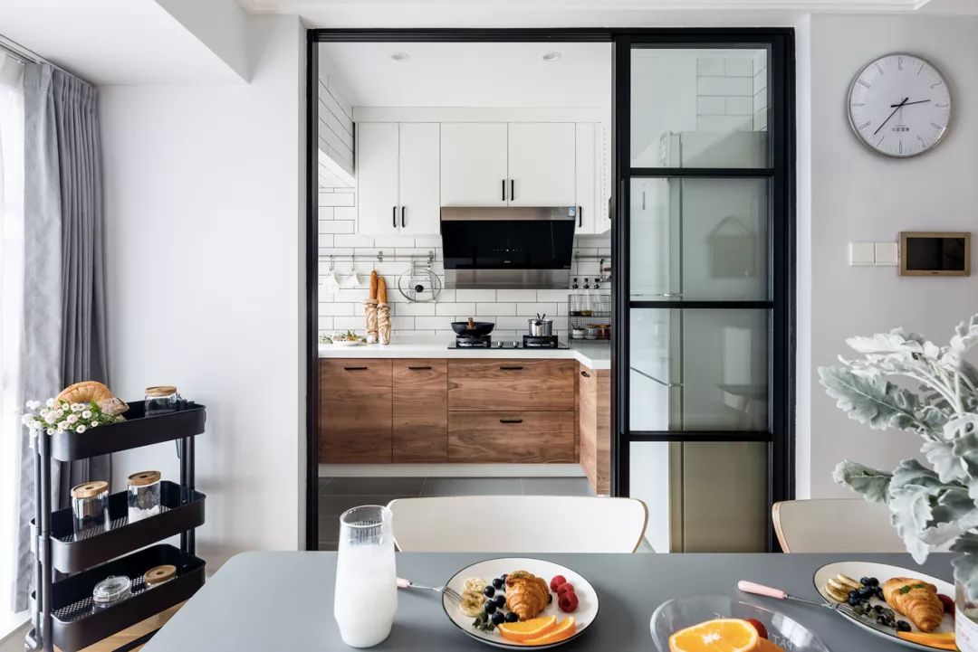 玻璃推拉門,增加廚房與餐廳的互動性。推拉門也更加節(jié)省空間。
