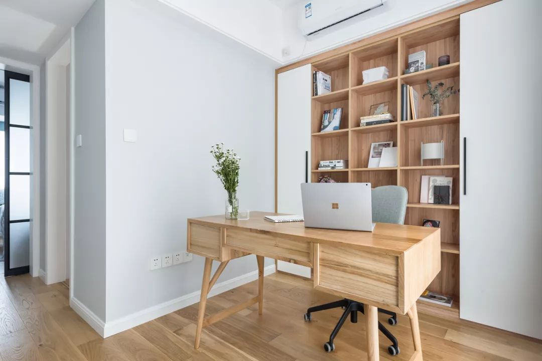 將原本和主臥相鄰的次臥與主臥打通,改造成在統(tǒng)一空間里的書房。