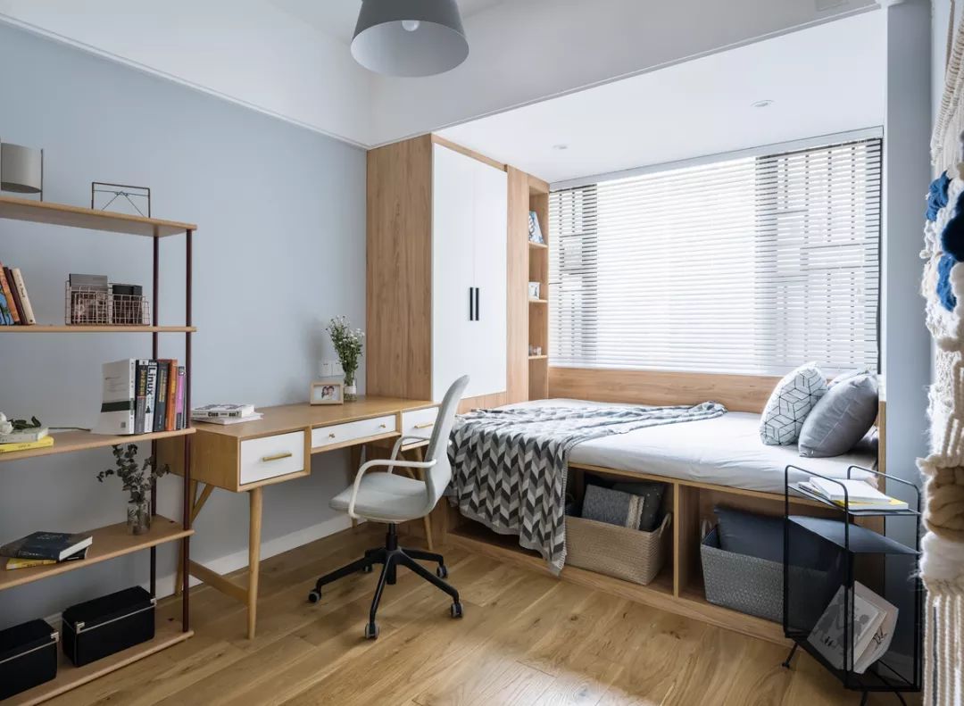 榻榻米方便收納,同時也有充足的采光,與櫥柜配套的小書桌,方便男女主人分開辦公。