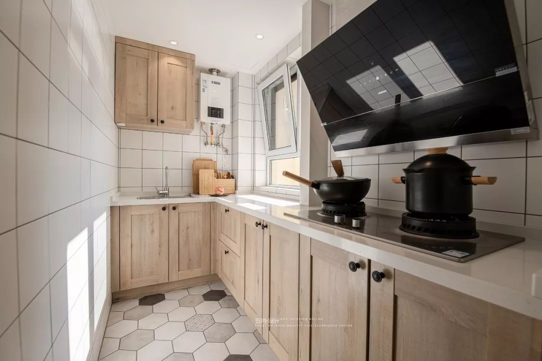 L型的廚房空間,墻面的白磚搭配原木色定制櫥柜,簡(jiǎn)潔自然,六邊形地磚的使用,增加了時(shí)尚感下趣味性。