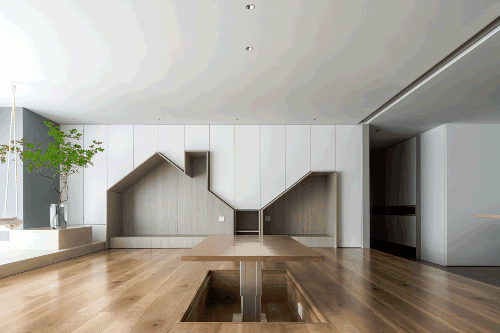 客廳移除常規(guī)的茶幾及沙發(fā),采用升降桌,僅配上幾個(gè)懶人沙發(fā)便可達(dá)到躺趴坐隨意切換的模式。