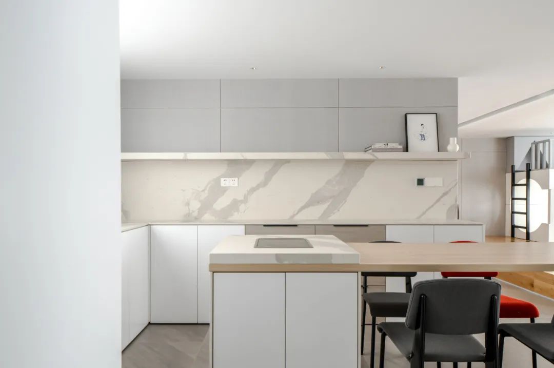 采用包圍式設(shè)計(jì),將餐廳與西廚合二為一。擱板代替吊柜,物品一目了然,拿取更加方便。