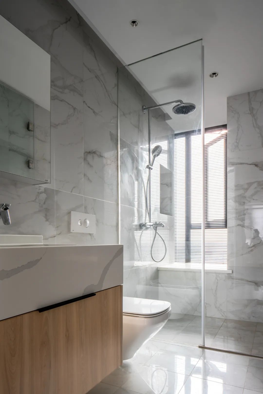 衛(wèi)生間使用干凈的大理石瓷磚,延續(xù)公共區(qū)域天然的質(zhì)感,純凈又舒適。