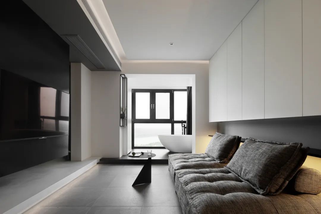 懸吊的電視柜,讓客廳和次臥隔而不斷,小空間看起來(lái)更加透氣。