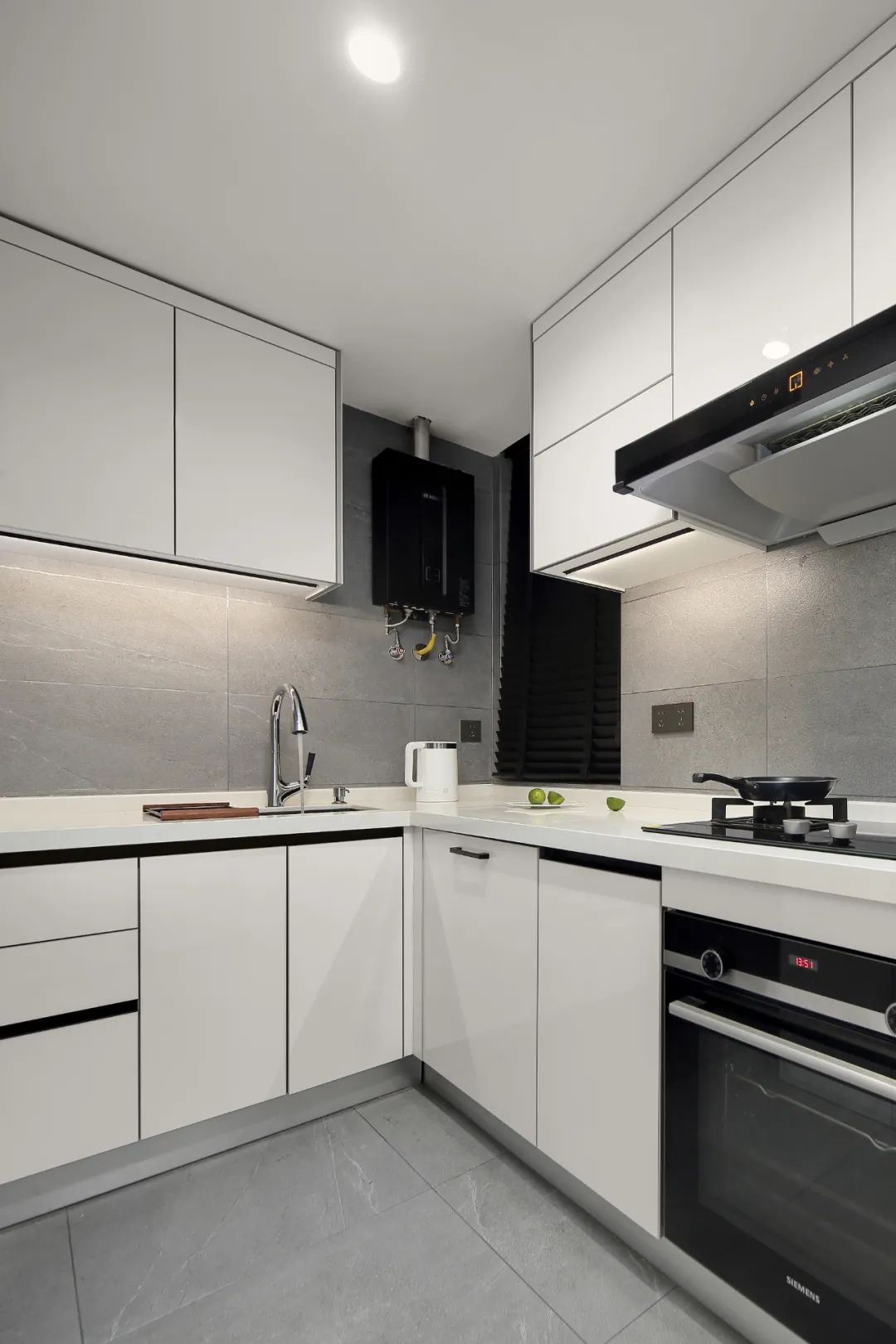 L型櫥柜,簡(jiǎn)潔實(shí)用,適合小戶型,吊柜底部嵌入燈帶,避免做飯時(shí)背光。