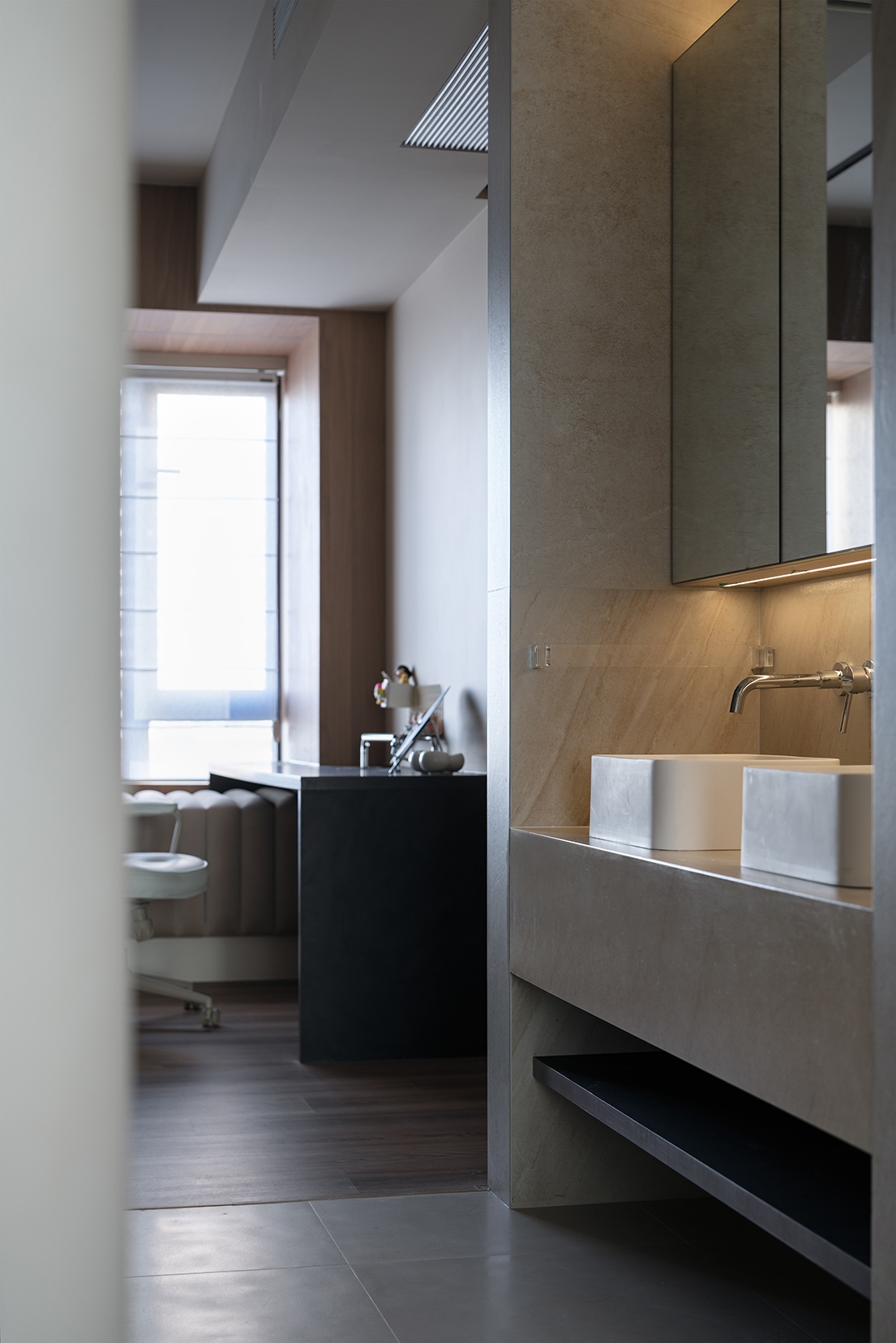 主臥以套房的形式規(guī)劃,南北相連波浪般的軟包造型,墻體內嵌的磁吸燈,燈光照射下是酣然入睡的夢 。